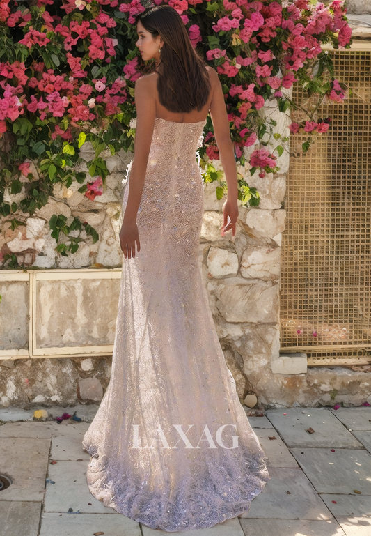 Strapless Fully Sequins Tulle illsuion High Slit Wedding Dress with Train