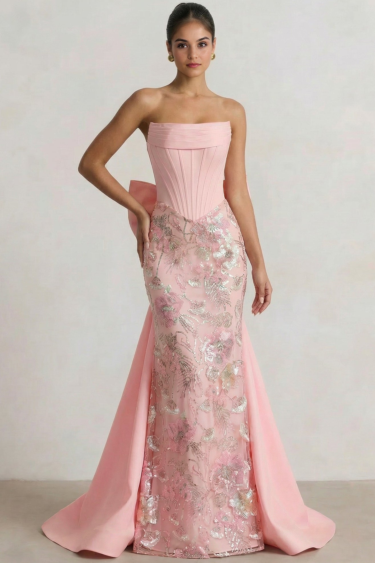 Make a stunning entrance in this elegant mermaid formal gown. The strapless tube top design offers a sophisticated silhouette, while intricate sequined appliqués catch the light with every movement. Luxurious satin fabric drapes beautifully with strategic pleating that enhances your curves, flowing seamlessly to a dramatic floor-length hem. Perfect for prom, galas, or black-tie events, this dress combines timeless glamour with modern design. The fitted mermaid cut flatters your figure before flaring gracefully at the bottom, creating an unforgettable look that commands attention.