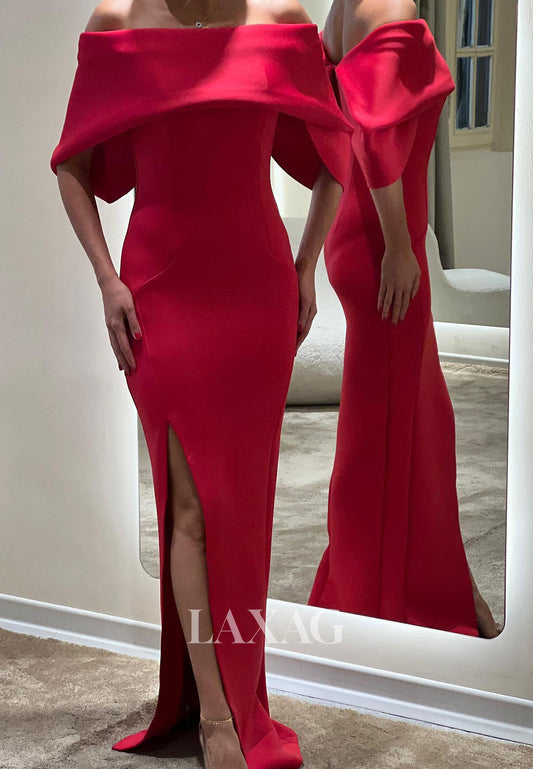 23166 - Off Shoulder Sleek Satin Elegant Party Prom Formal Evening Dress with Slit