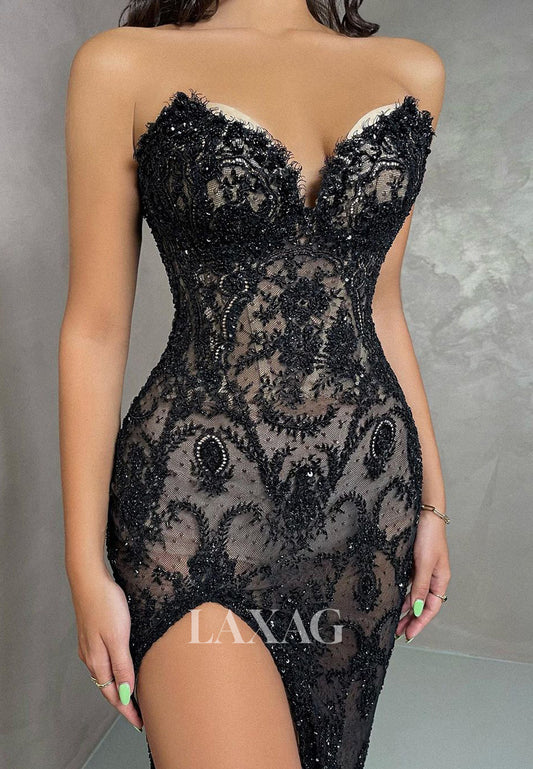 Sexy Strapless Lace Beaded High Slit Prom Dress Sweetheart Sleeveless Pleated Formal Evening Gowns