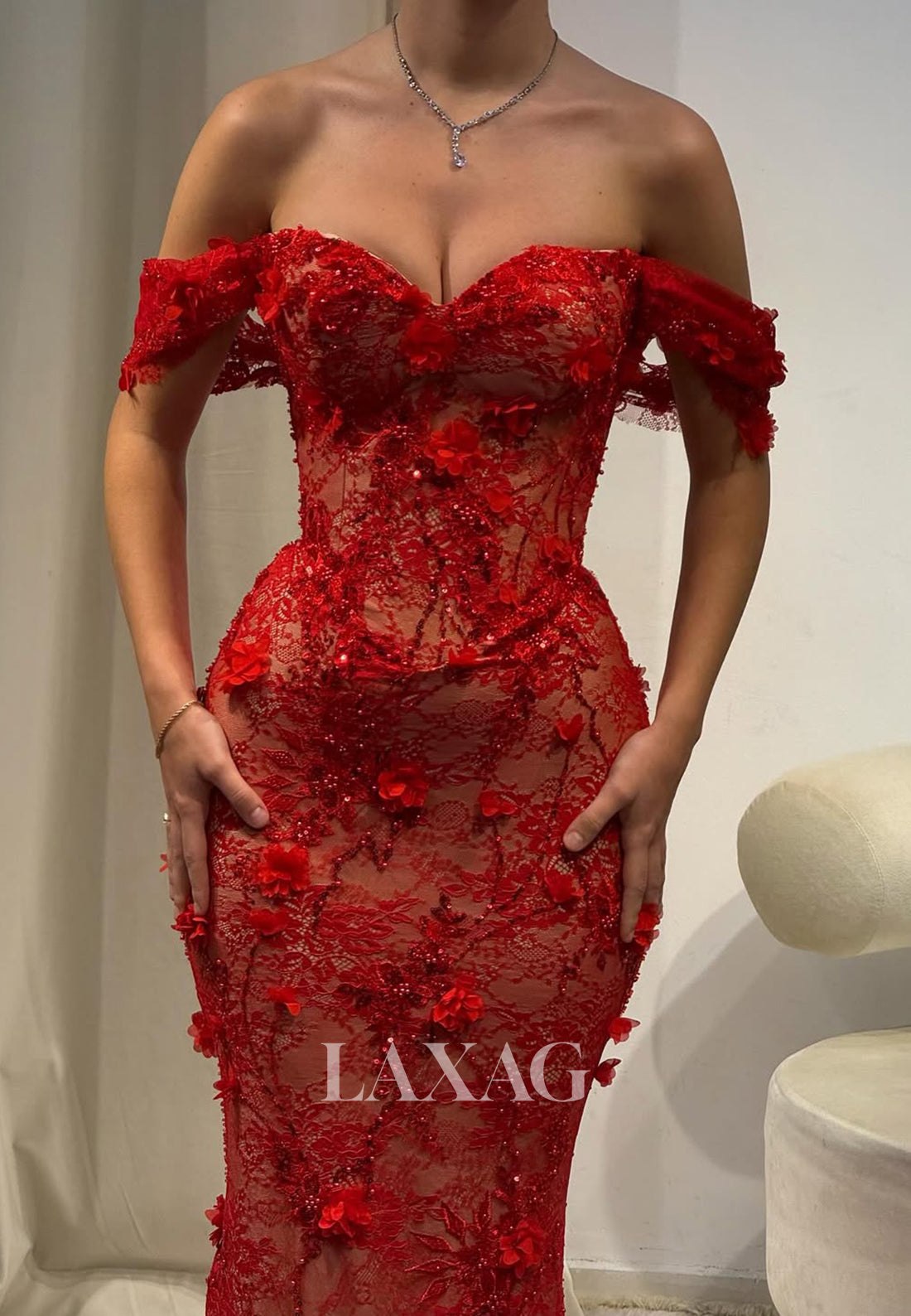 Sweetheart Beaded Allover Lace Party Gowns Off-Shoulder Floral Embellished Mermaid Prom Dress