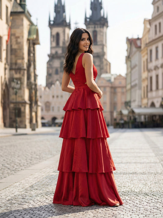 V-Neck Spaghetti Straps Sleeveless Floor-Length Satin Pleated Tiered A-Line Prom Dress