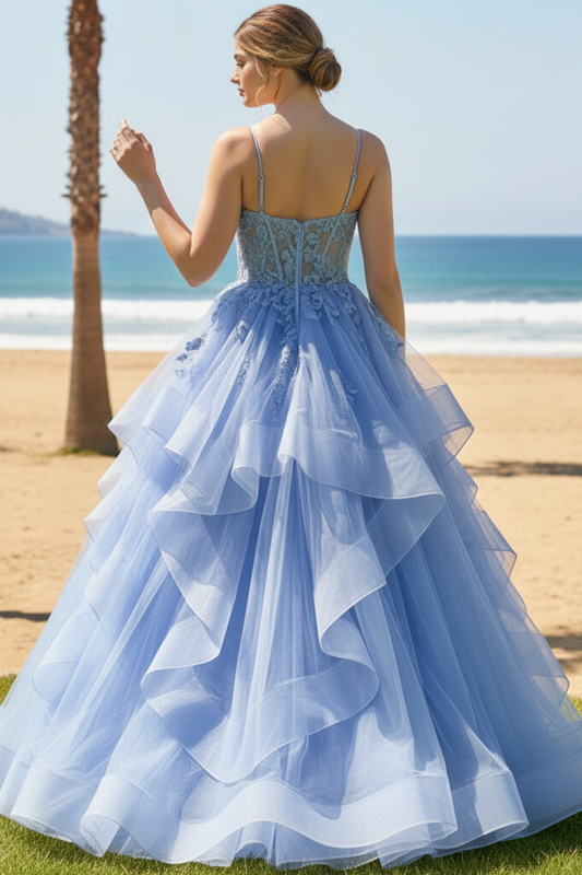V-Neck Spaghetti Straps Sleeveless Floor-Length Applique Tulle Tiered A-Line Prom Dress