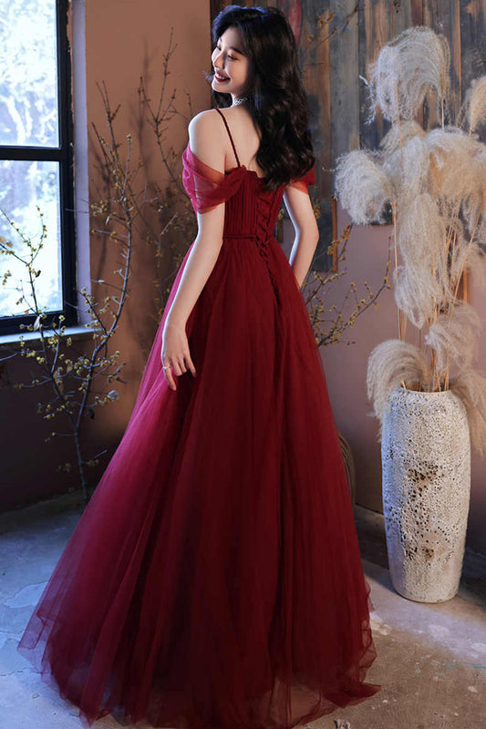 V-Neck Spaghetti Straps Sleeveless Floor-Length Tulle Pleated A-Line Prom Dress