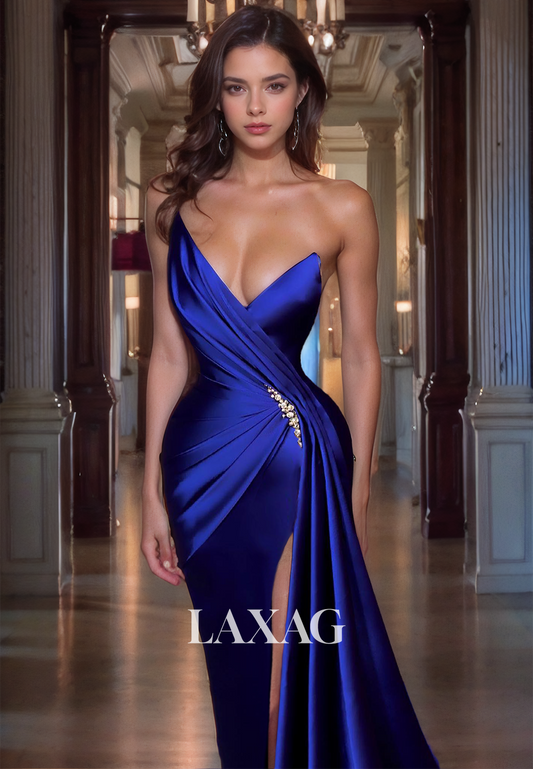 Strapless Beaded Satin High Slit Party Dress Sweetheart Pleated Sweep Train Prom Dress
