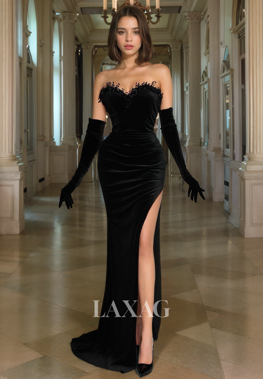 Strapless Beaded Sleek Satin High Slit Mermaid Party Prom Formal Evening Dress with Gloves