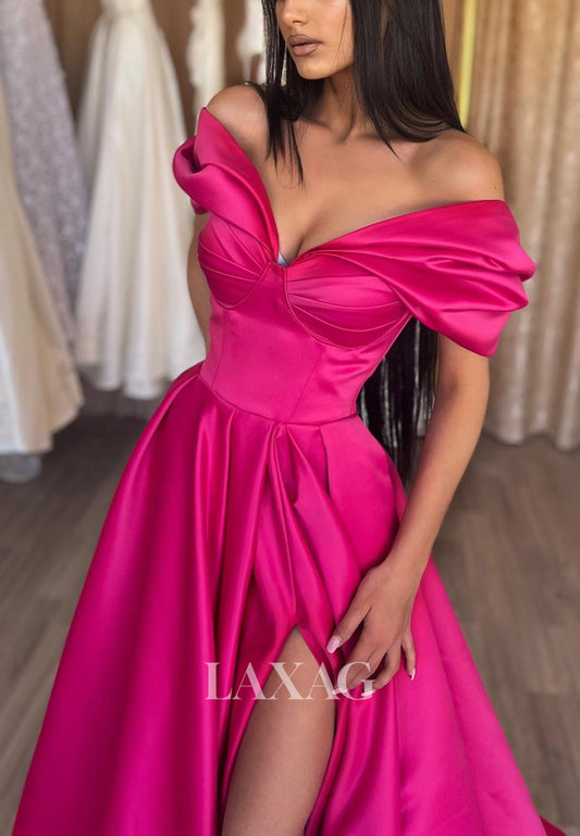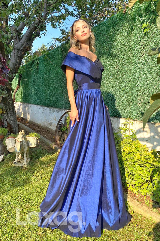19709 - Off Shoulder Satin Pleats A-line Long Prom Dresses