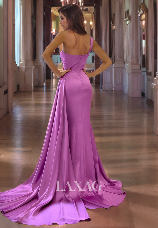 18798 - Chic One Shoulder Purple Satin Pleats Mermaid Formal Evening Dresses