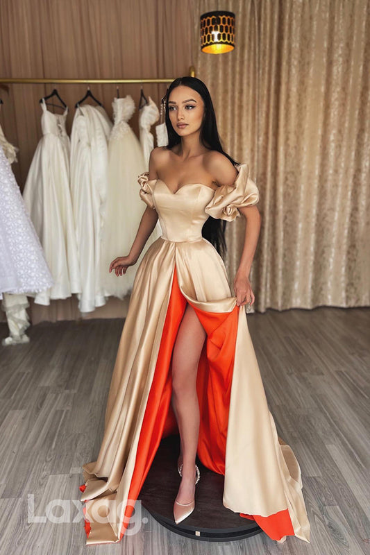 19741 - A Line Off Shoulder Satin Ruched Long Formal Prom Dress with Slit