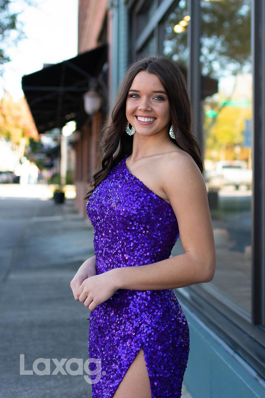 18776 - One Shoulder Sequined Thigh Slit Long Prom Dresses