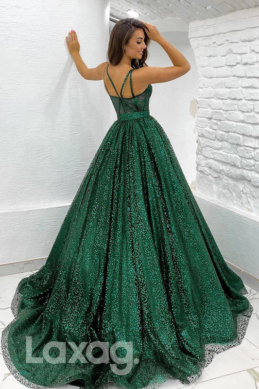19711 - Women's Spaghetti Straps Green Long Prom Ball Gown Glitter