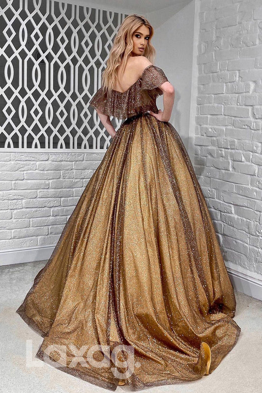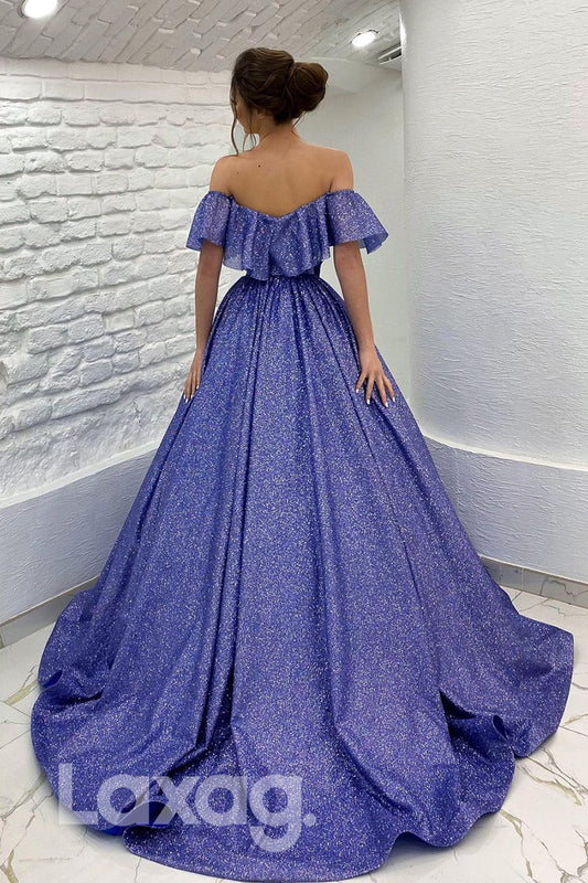 18795 - Off Shoulder Ball Gown Half Sleeves Sparkly Prom Dresses with Pockets