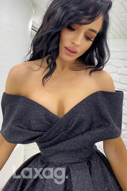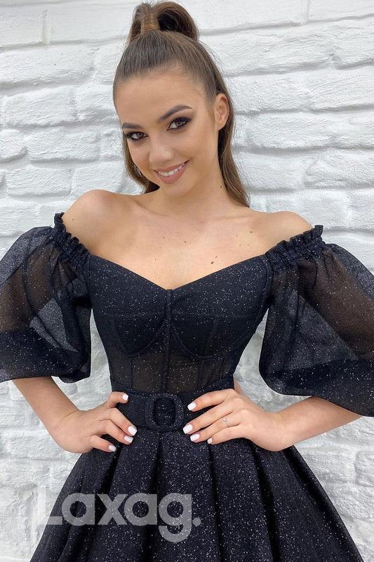 18796 - Off Shoulder Half Sleeves Black Sparkly Prom Dresses with Pockets