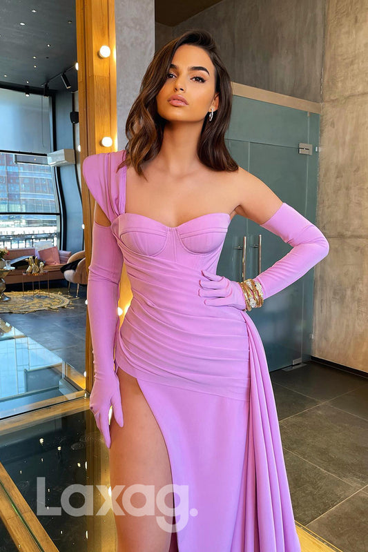 19765 - Lavender One Shoulder Slit Long Prom Gown with Gloves