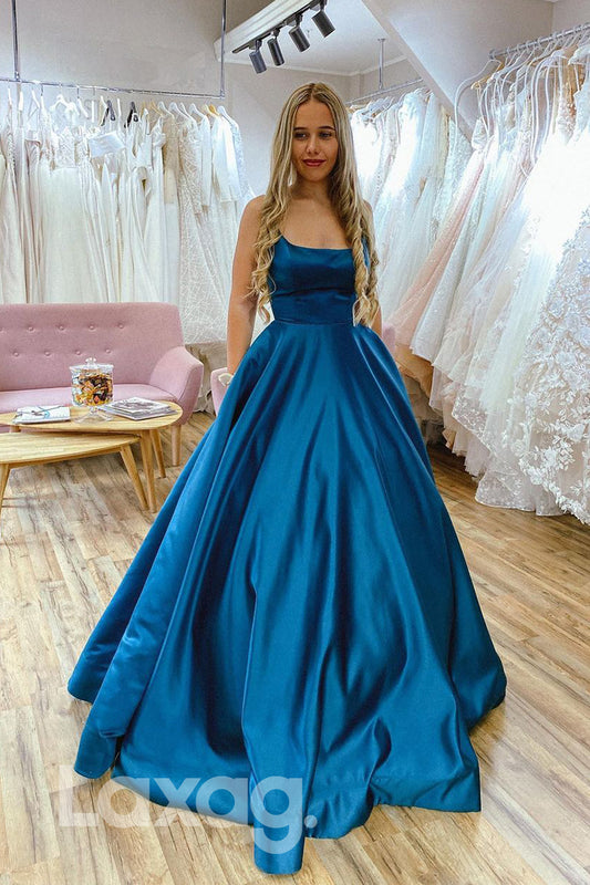 18786 - Women's Scoop Blue Satin Long Simple Prom Dresses with Pockets