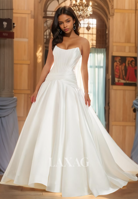 Simple Sweetheart Sleeveless Satin A-Line Prom Dress Strapless Pleaded High Slit Formal Gowns