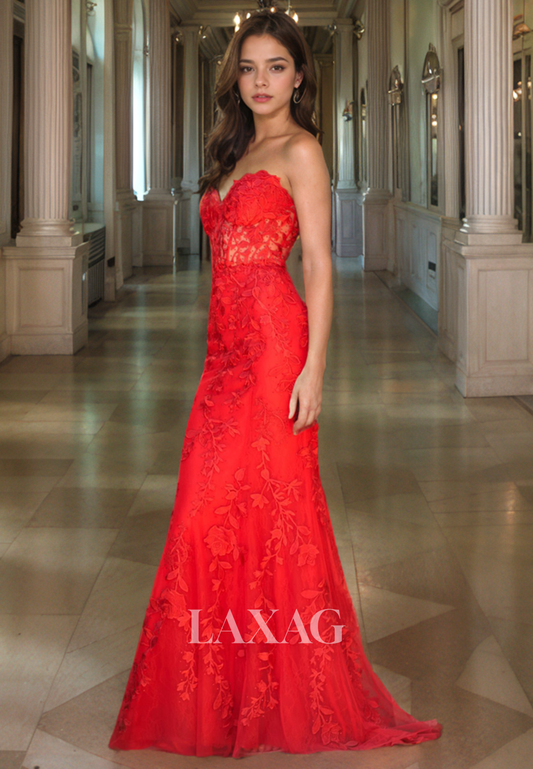 Strapless Lace Appliques Sleek Satin Mermaid Party Prom Formal Evening Dress