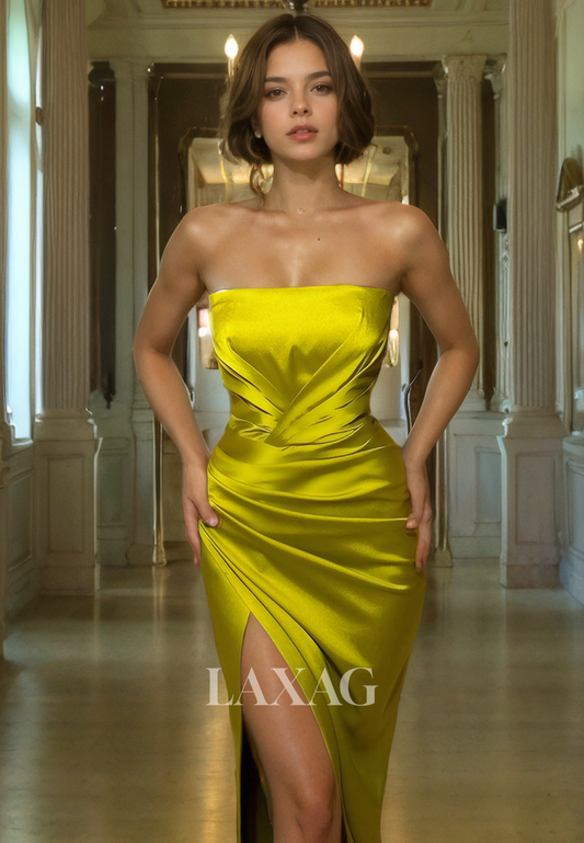 Strapless Pleated Sleek Satin High Slit Prom Dress Sleeveless Pleated Formal Evening Gowns with Sweep Train