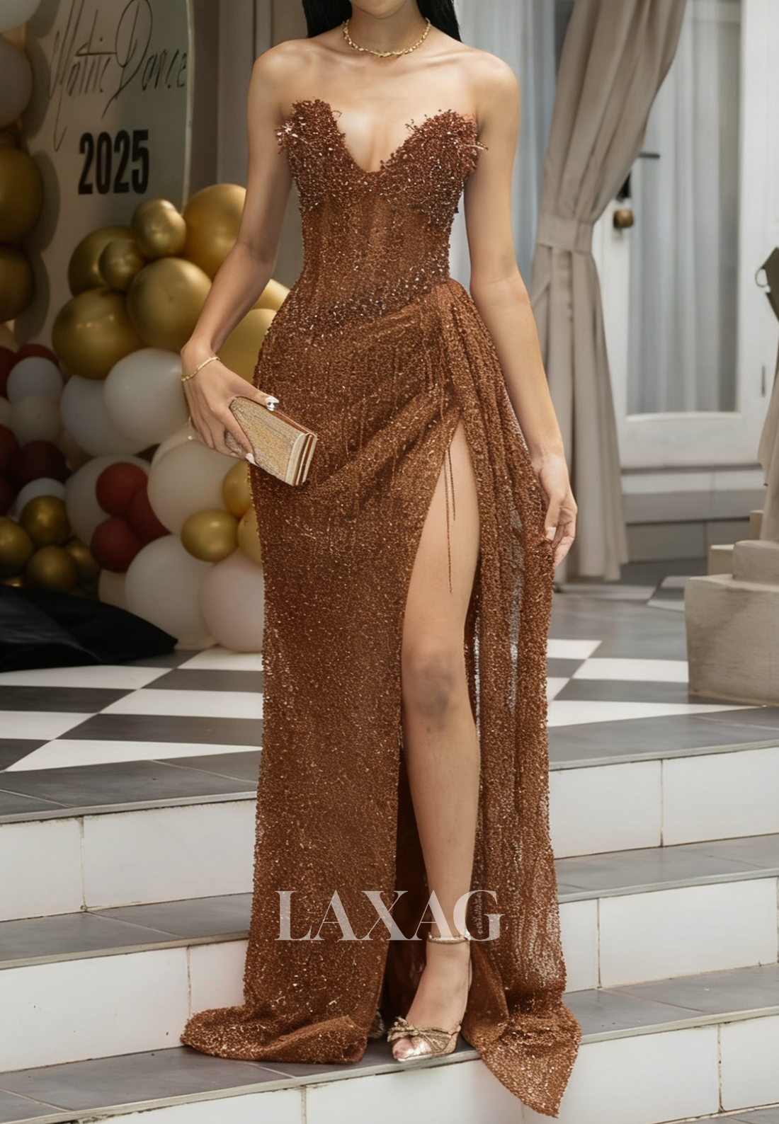 V-Neck Off-Shoulder Sleeveless Mermaid Prom Dress Fully Beaded Pleated High Slit Party Gowns