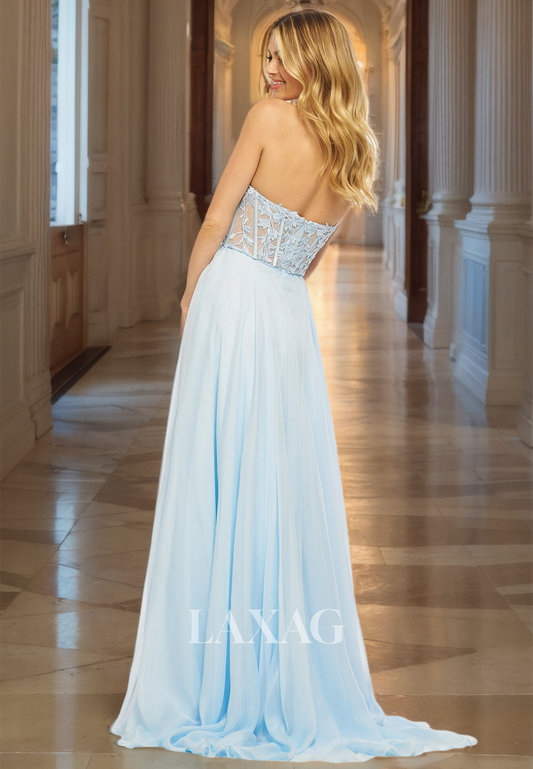 Tube Top Sleeveless Pleated Chiffon A-Line Prom Dress Lace Applique Sweep Train Evening Gowns