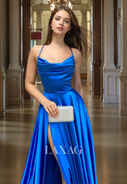 Tube Top Sleeveless Spaghetti Straps A-Line Prom Dress Pleated High Slit with Sweep Train Party Dress