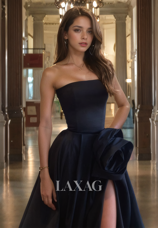 Tube Top Sleeveless Pleated A-Line Prom Dress Floral Embellished Satin Formal Gowns with Slit