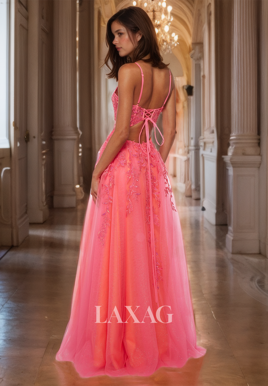 V-Leck Spaghetti Straps Sleeveless Floor-Length A-Line Formal Prom Dress with Beaded and Applique