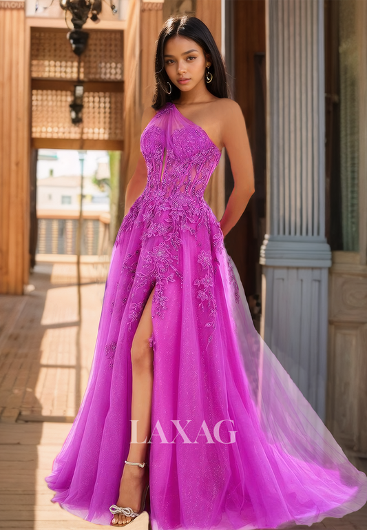 Tulle One-Strap Sweetheart Sleeveless Party Dress Pleated Applique Cutout High Slit Prom Dress