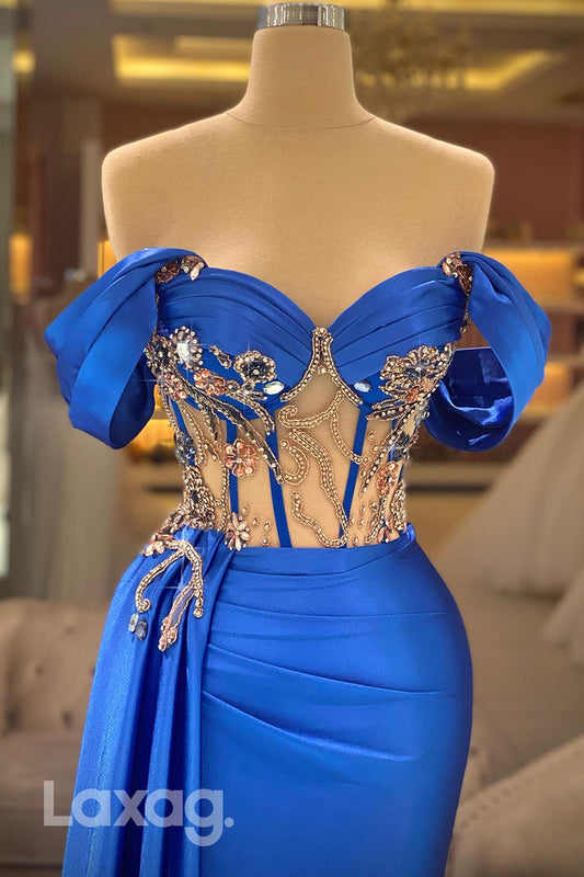21878 - Off Shoulder Beads Blue Mermaid Prom Evening Dress with Gloves