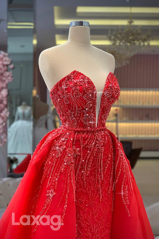 21861 - Sexy Deep V neck Heavy Beads Detachable Skirt Red Long Mermaid Formal Prom Dress with Slit