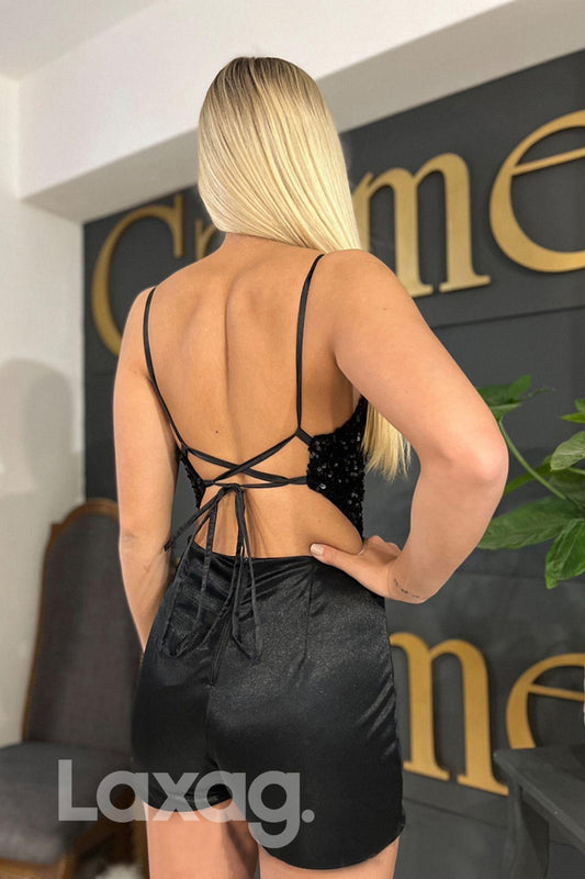 21803 - Spaghetti Keyhole Thigh Slit Black Sequins Prom Dress