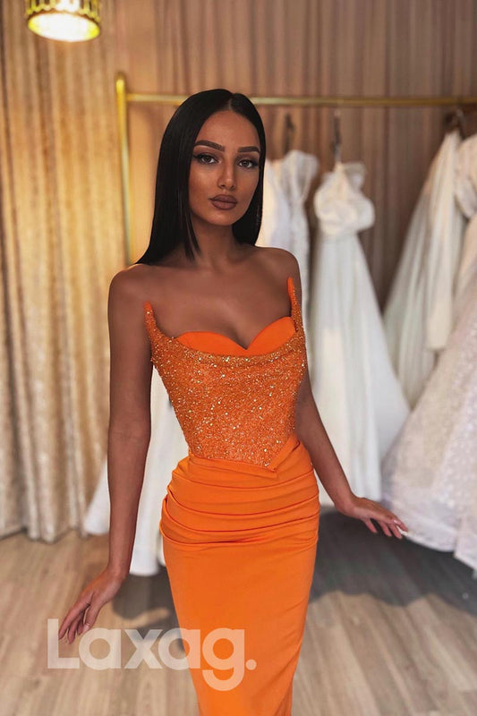 21863 - Strapless Orange Sequins Top Satin Prom Evening Dress