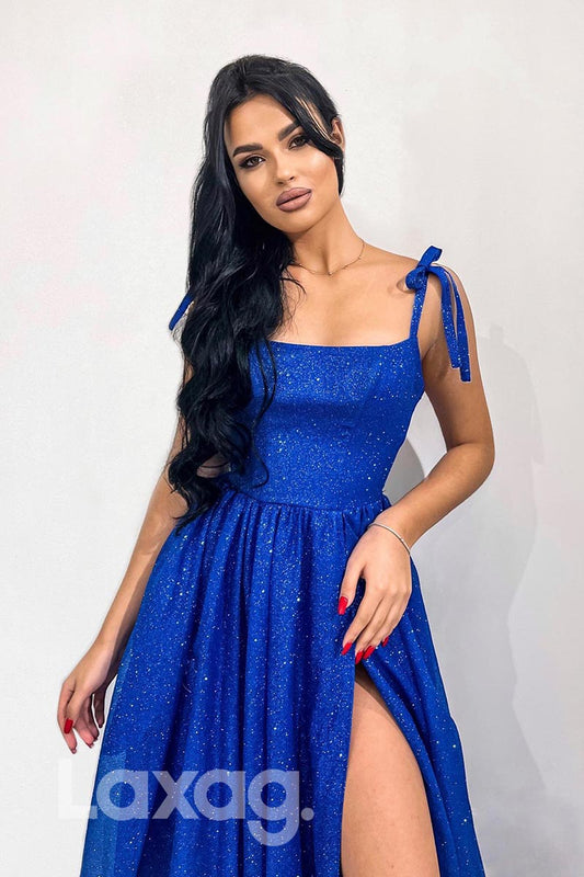 21825 - Spaghetti V Neck Thigh Slit Blue Prom Evening Dress