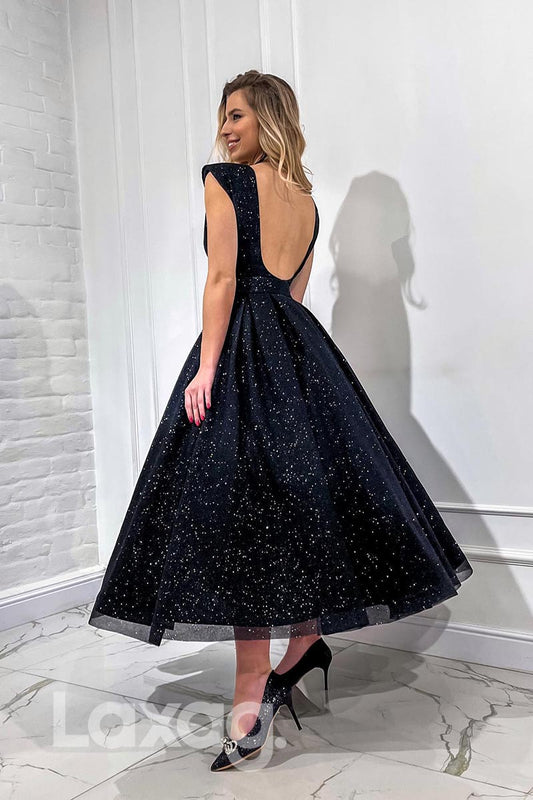 21885 - Glitter V Neck Backless Ankle Length Prom Evening Dress
