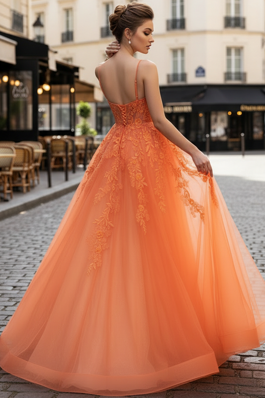 V-Neck Spaghetti Straps Sleeveless Floor-Length Applique Tulle Tiered A-Line Prom Dress