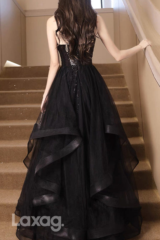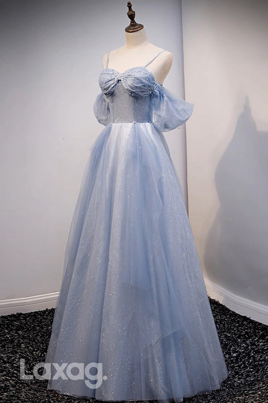 22438 - A-Line Spaghetti Straps Pearls Sequins Tulle Party Prom Formal Evening Dress with Slit