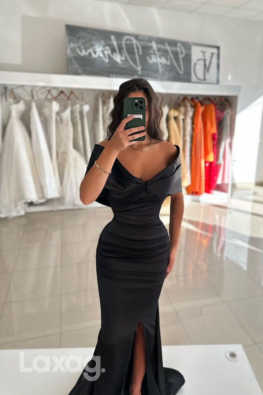22243 - Off Shoulder Draped Sleek Satin Mermaid Prom Formal Evening Dress with Slit