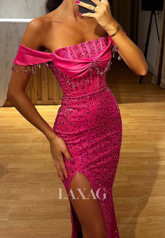 Off-shoulder Beaded Fully Sequins High Slit Party Gowns Tube Top Sleeveless Mermaid Prom Dress