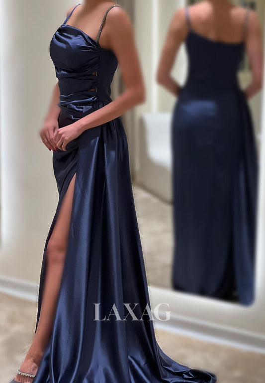 23159 - Spaghetti Straps Pleated Sleek Satin High Slit Party Prom Formal Evening Dress