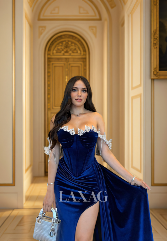 22312 - A-Line Strapless Beaded High Slit Party Prom Formal Evening Dress