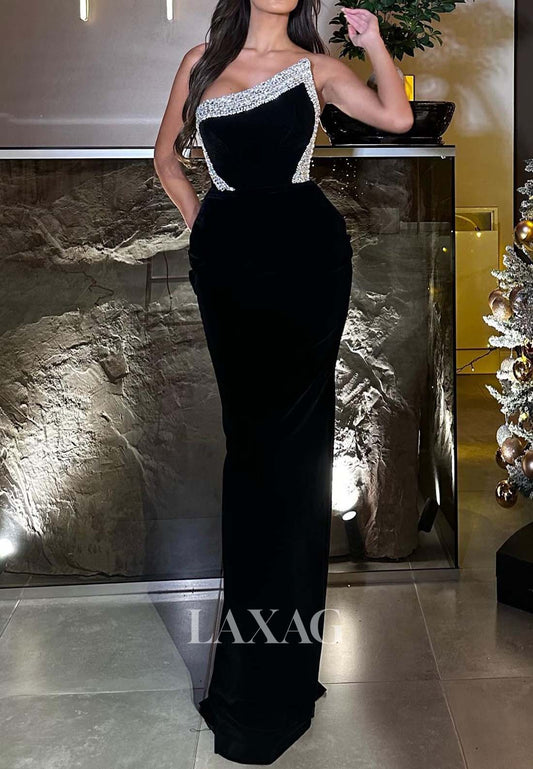 Asymmetrical-Neck Beaded Satin Mermaid Prom Dress Off-Shoulder Sleeveless Floor-Length Evening Gowns