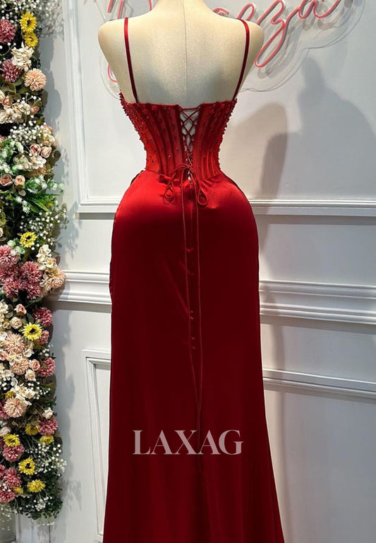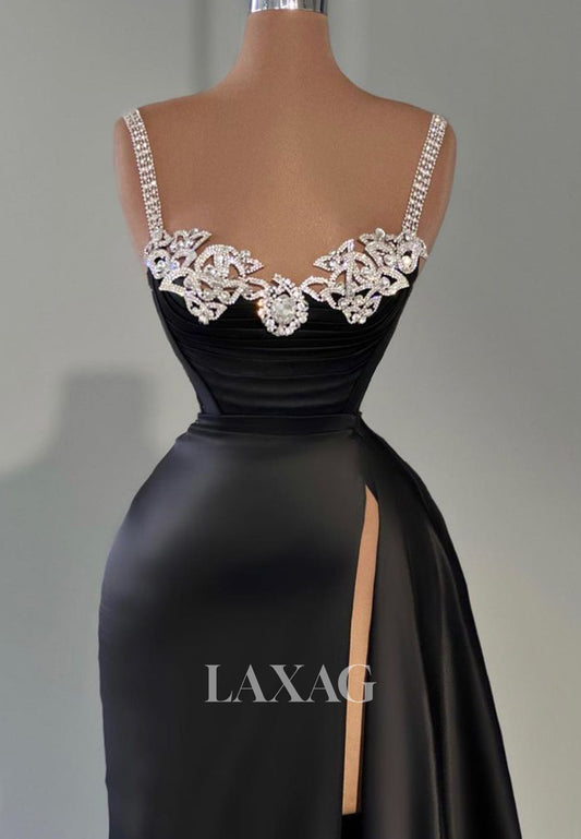 Sweetheart Spaghetti Straps Sleeveless Mermaid Prom Dress Beaded Pleated High Slit Evening Gowns