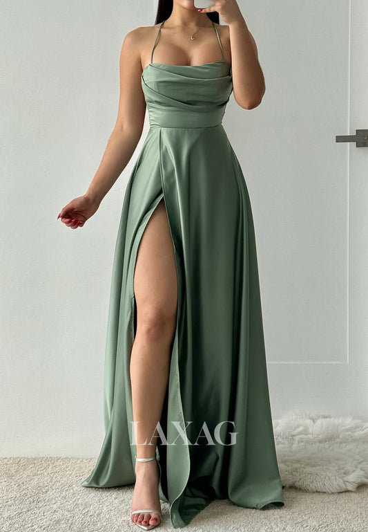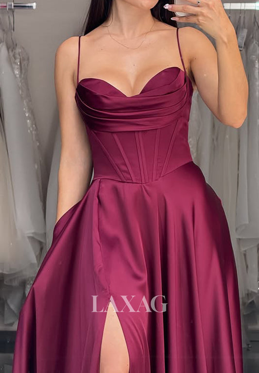 Spaghetti Straps Sweetheart A-Line Prom Dress Sleeveless Pleated Satin Formal Gowns with Slit