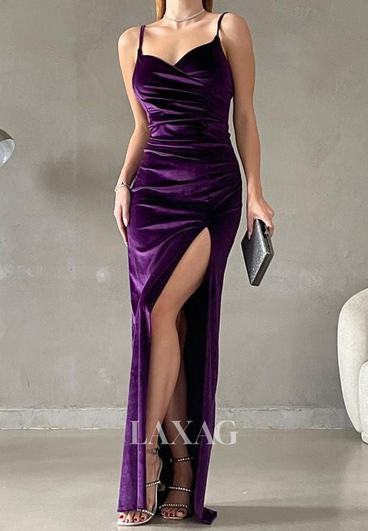 Sweetheart Spaghetti Straps Floor-Lengrh Mermaid Prom Dress Sleeveless Pleated Party Gowns with Slit
