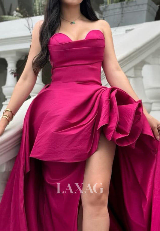 A-Line Sweetheart Off-Shoulder Sleeveless Pleated High Slit Satin Prom Dress with Sweep Train