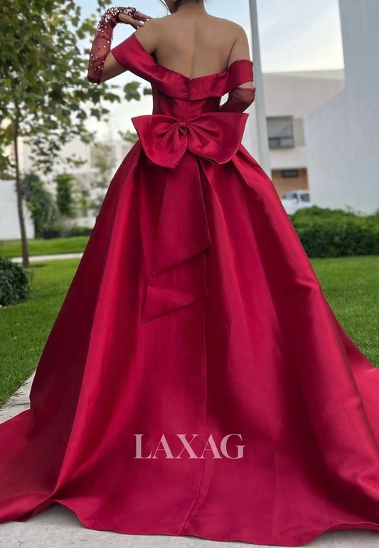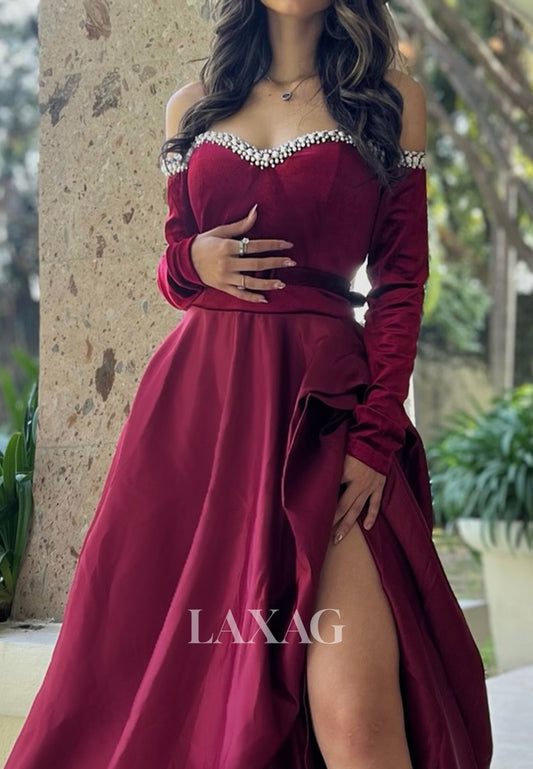 A-Line Sweetheart Long-Sleeves High Slit Prom Dress Off-Shoulder Pearl Pleated Satin Evening Gowns