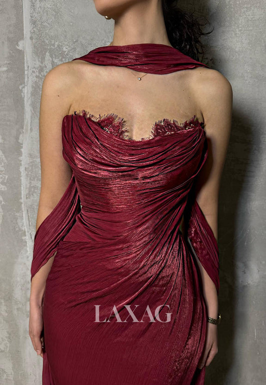 Sweetheart Off-Shoulder Pleated High Slit Mermaid Prom Dress Sleeveless Metallic Satin Formal Gowns