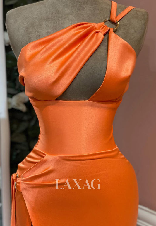 Asymmetrical-Neck Spaghetti Straps Mermaid Prom Dress Sleeveless Cutout Pleated Satin Formal Gowns