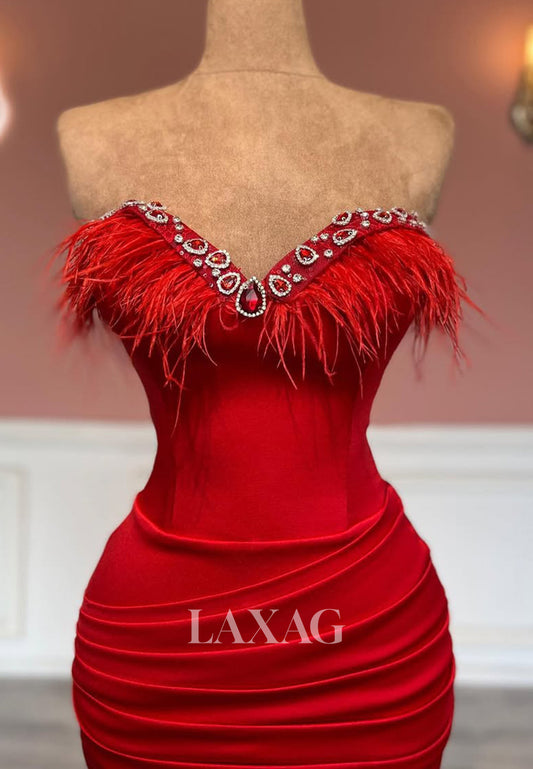 Beaded Sweetheart Sleeveless Pleated Evening Gowns Off-Shoulder Satin Mermaid Prom Dress with Gloves