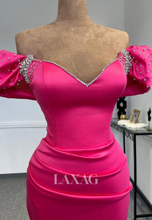 Off-Shoulder Scoop-Neck Long-Sleeves Evening Gowns Rhinestone Pleated Satin Mermaid Prom Dress